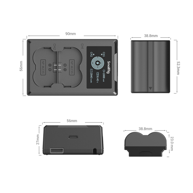 SmallRig Súprava batérií a nabíjačky NP-W235 3822 obsahuje dve batérie a jednu nabíjačku. Batéria vybavená kompletným dekódovacím čipom dokonale podporuje rôzne fotoaparáty bez toho, aby spôsobovala vyskakovacie okná, a má kvalitný ohňovzdorný ABS a matný plášť PC, ktorý zabezpečuje jemný dotyk a odolnosť. Má rovnakú veľkosť ako originálna batéria, a tak bez problémov zapadne do priestoru na batérie. Duálna nabíjačka batérií dokáže nabíjať dve batérie súčasne, pričom jej LCD displej zobrazuje nabíjacie napätie, prúd a nabitú kapacitu v reálnom čase. Dodáva sa so zabudovaným nabíjacím káblom USB-A a vstupným rozhraním USB-C, čo umožňuje nabíjanie cez adaptér USB, nabíjačku do auta, powerbanku.