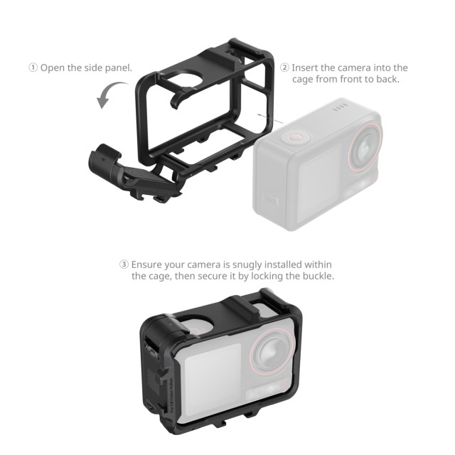 Do priestoru na batériu sa dá dostať priamo z boku bez nutnosti demontáže klietky, čo umožňuje bezproblémovú výmenu batérie. Okrem toho otvor na šnúrku na jednej strane umožňuje používateľom v prípade potreby pripojiť šnúrku, čo poskytuje väčšiu bezpečnosť kamery v náročných prostrediach, zatiaľ čo zabudované gumové podložky pomáhajú predchádzať poškriabaniu kamery.