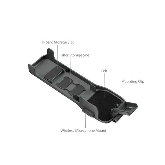 Integrovaný úložný priestor obsahuje dva špeciálne sloty na filtre (pre filtre ND a CPL s hrúbkou až 2 mm / 0,08″), dva držiaky na TF karty a držiak na bezdrôtový mikrofón, čo zvyšuje pohodlie a prenosnosť pri fotografovaní vonku. Vďaka užívateľsky prívetivému dizajnu sa puzdro dá rýchlo nainštalovať jednoduchým zasunutím zhora a poskytuje ľahký prístup k fotoaparátu prostredníctvom odklápacieho veka.