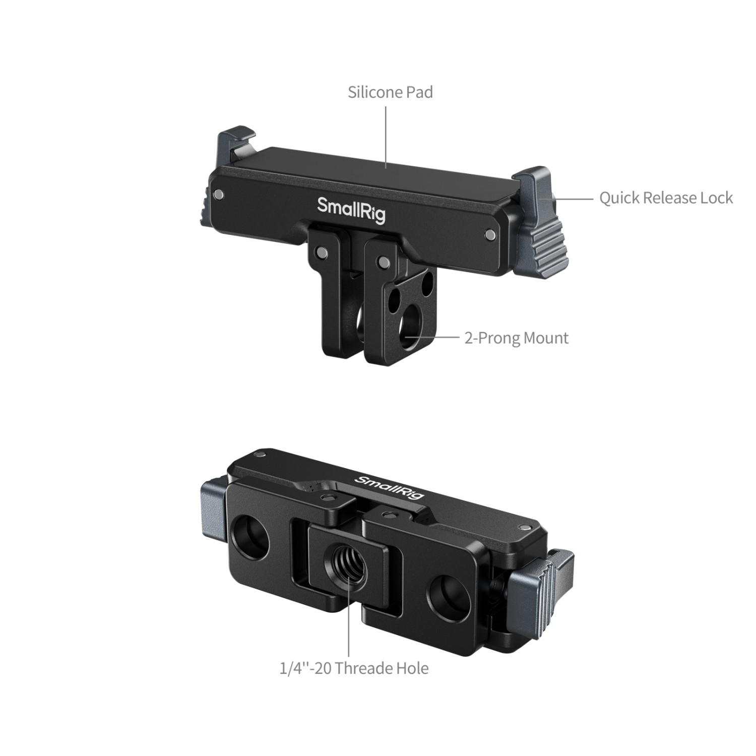 Základňa je vybavená skladacím 2-bodovým držiakom a závitom 1/4"-20, čo zaručuje širokú kompatibilitu s príslušenstvom SmallRig, ako sú držiaky s prísavkami (ID 4235), krabie klepetá (ID 4102B), selfie tyčami (ID 5403) a držiakmi na krk (ID 5126).