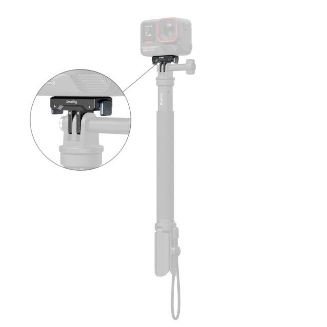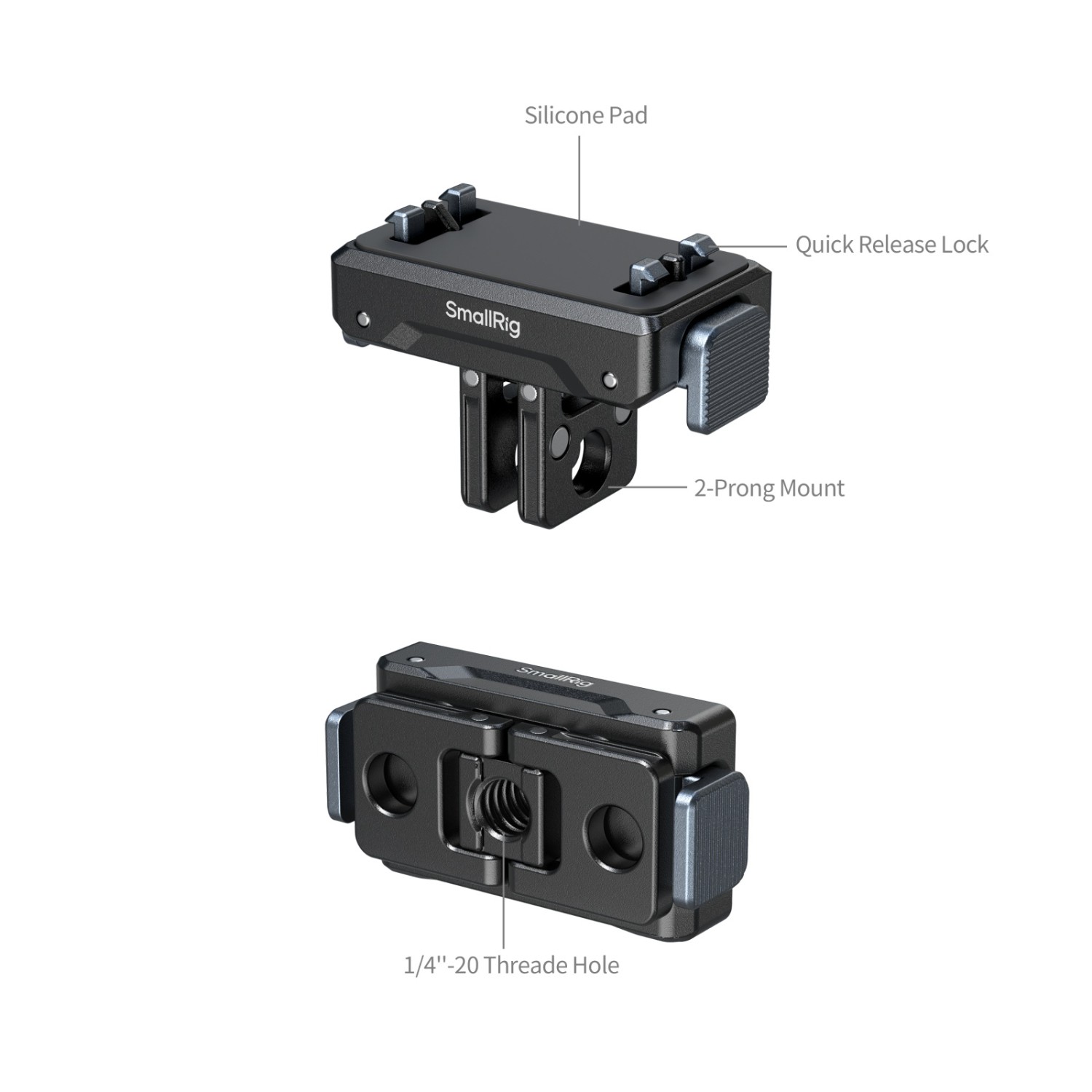 Základňa je vybavená 2-kolíkovým uchytením a jedným 1/4"-20 závitovým uchytením, čo zaručuje kompatibilitu s rôznymi príslušenstvami SmallRig, vrátane prísavných držiakov (ID 4235), krabích svoriek (ID 4102B), selfie tyčí (ID 5403) a držiakov na krk (ID 5126).