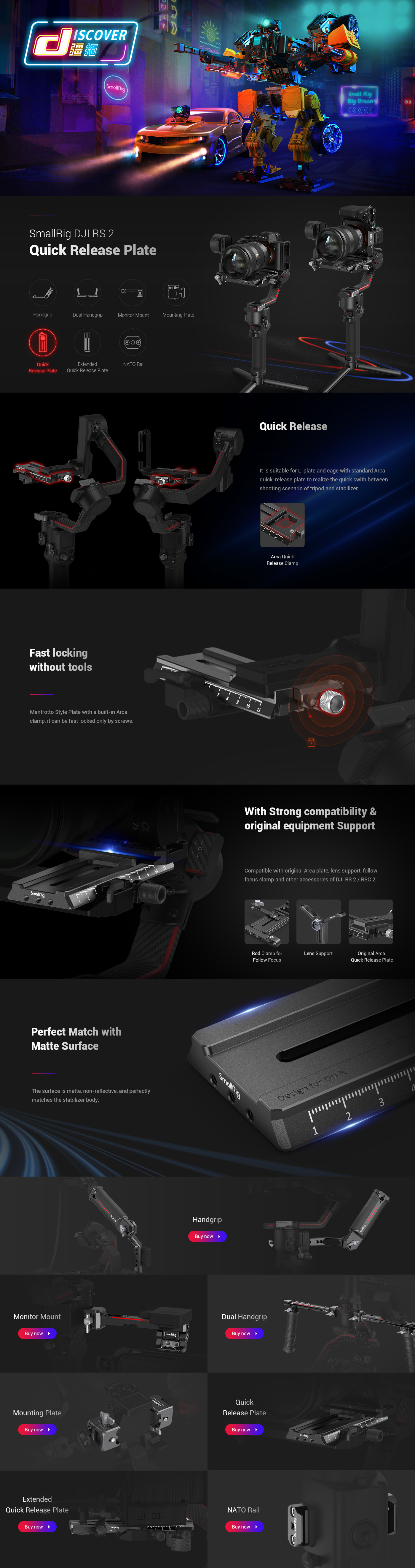 Rýchloupínacia doštička SmallRig s Arca-Swiss pre DJI RS 2 / RSC 2/Ronin-S / RS 3 / RS 3 Pro 3061 je navrhnutá tak, aby pomáhala používateľom pri priamej inštalácii L držiaka a klietky štandardu Arca-Swiss na gimbal, vďaka čomu môžu rýchlo prepínať medzi statívmi a gimbalom, čím šetria čas používateľov. Rýchloupínacia doštička je typu Manfrotto so zabudovanou základňou Arca-Swiss a dá sa rýchlo uzamknúť pomocou skrutky s palcom bez použitia náradia. Má nastaviteľnú konštrukciu proti pádu, ktorá môže dosiahnuť funkciu proti pádu aj pri spojení s originálnou doskou Arca. Dá sa tiež stlačiť, aby sa prispôsobila štandardnému držiaku Arca-Swiss L a klietke na trhu. Rýchloupínacia doštička preberá pôvodnú konštrukciu doštičky kamery a je kompatibilná s pôvodnou doštičkou Arca-Swiss, držiakom zaostrovacej tyče vybaveným DJI RS 2 / RSC 2 / RS 3 / RS 3 Pro / DJI RS 4 / DJI RS 4 PRO, a v spodnej časti má ozubený hrebeň, ktorý umožňuje mierne nastavenie rýchloupínacej doštičky.