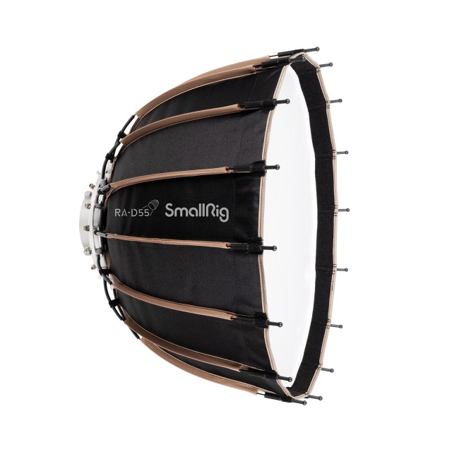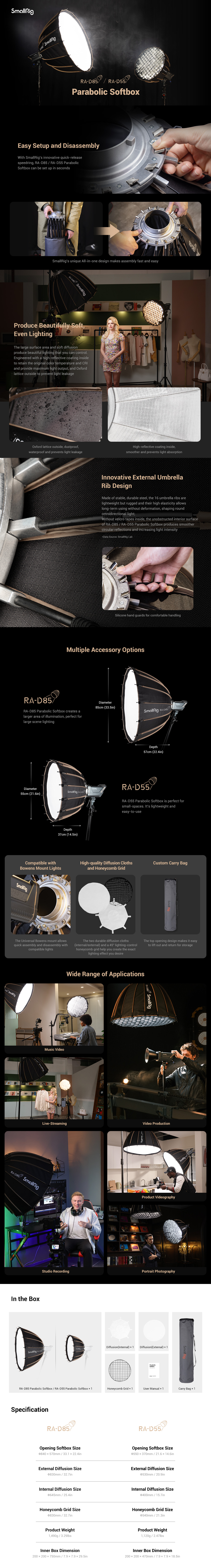 SmallRig RA-D55 Parabolic Softbox 3585 je všestranné mäkké svetelné príslušenstvo s priemerom 55 cm. Vďaka univerzálnemu dizajnu s držiakom Bowens je kompatibilný so svetlami SmallRig RC 120D/RC 120B/RC 220D/RC220B a inými svetlami s držiakom Bowens. Vďaka novému rýchloupínaciemu dizajnu môžete kopulu ľahko nainštalovať a demontovať za 15 sekúnd. Súčasťou balenia RA-D55 je aj vysokokvalitný látkový voštinový filter, dva difúzne filtre (interný + externý) a prepravná taška.