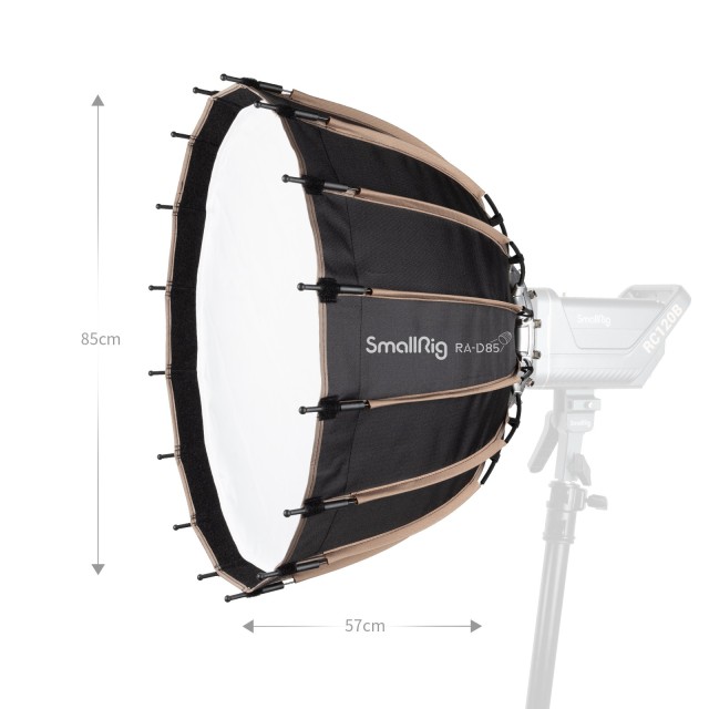 SmallRig RA-D85 Parabolic Softbox 3586 je univerzálne príslušenstvo s priemerom 85 cm. Vďaka univerzálnemu dizajnu s držiakom Bowens je kompatibilný so svetlami SmallRig RC 120D/RC 120B/RC 220D/RC220B a inými svetlami s držiakom Bowens. Vďaka novému rýchloupínaciemu dizajnu môžete kopulu ľahko nainštalovať a demontovať za 15 sekúnd.