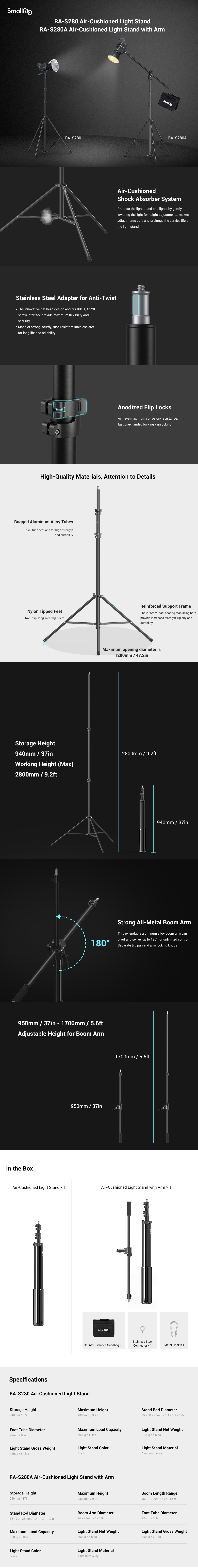 Konštrukcia so vzduchovým polstrovaním chráni svetlá a prsty pred náhodným pádom. Voľne nastaviteľná výška od 94 cm do 280 cm, vhodná pre rôzne scenáre; zložená dĺžka 94 cm, ľahko sa prenáša. Vyrobené prevažne z hliníkovej zliatiny a železa; železná nosná tyč má hrúbku 2,66 mm a šírku 15 mm a kľučka z hliníkovej zliatiny je pevná a odolná; dodáva sa s vysokou nosnosťou, ako aj s rýchlym a účinným zámkom preklopenia.
