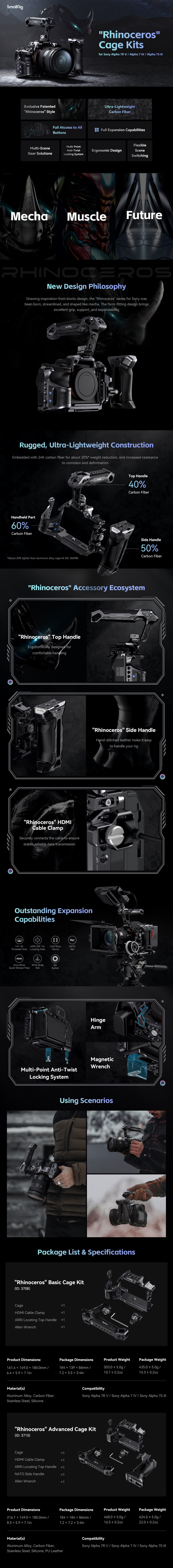 SmallRig "Rhinoceros" Advanced Cage Kit pre Sony Alpha 7R V / Alpha 7 IV / Alpha 7S III 3710 je navrhnutý tak, aby znížil záťaž na ramená, zvýšil stabilitu a poskytol montážne body pre príslušenstvo. Súprava obsahuje klietku, hornú rukoväť, bočnú rukoväť a svorku na kábel HDMI. Klietka a obe rukoväte sú prenosné, pretože sú vyrobené z ľahších uhlíkových vlákien, a teda umožňujú dlhšie snímanie z ruky. V prípade klietky sú to polohovací kolík, skrutka 1/4"-20 a skrutka M2,5, ktoré spoločne pevne zafixujú fotoaparát. Vyznačuje sa čistým zjednodušeným dizajnom, ktorý poskytuje úplný prístup k horným tlačidlám. Horná rukoväť je pohodlná na prenášanie a snímanie pod nízkym uhlom; bočná rukoväť, vyrobená z ľahkých uhlíkových vlákien a PU kože, umožňuje príjemné a pevné uchopenie. a svorka kábla HDMI, uťahovaná pomocou skrutky s plochou hlavou, chráni rozhrania a zabezpečuje stabilný prenos signálu. Súčasťou súpravy sú aj otvory so závitom 1/4"-20 pre rameno Magic Arm 3873, držiaky studenej pätice pre mikrofón, LED video svetlo a polohovacie otvory ARRI 3/8"-16 pre bočnú rukoväť 2914. Koľajnica NATO a rýchloupínacia doska Arca-Swiss zvyšujú univerzálnosť klietky. Najmä doska Arca-Swiss umožňuje rýchle prepínanie medzi režimami ručného držania, statívu a gimbalu (DJI RS 2 / RSC 2 / RS 3 / RS 3 Pro).