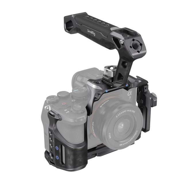 Základná súprava klietky SmallRig "Rhinoceros" pre Sony Alpha 7R V / Alpha 7 IV / Alpha 7S III 3708 je navrhnutá tak, aby uľahčovala snímanie pod nízkym uhlom, chránila fotoaparát a poskytovala body na upevnenie príslušenstva. Súprava obsahuje klietku, hornú rukoväť a svorku na kábel HDMI. Klietka aj horná rukoväť sú prenosné, pretože sú vyrobené z ľahších uhlíkových vlákien, a teda umožňujú dlhšie snímanie z ruky. V prípade klietky sú to polohovací kolík, skrutka 1/4"-20 a skrutka M2,5, ktoré spoločne pevne zafixujú fotoaparát. Vyznačuje sa čistým zjednodušeným dizajnom, ktorý poskytuje úplný prístup k horným tlačidlám.