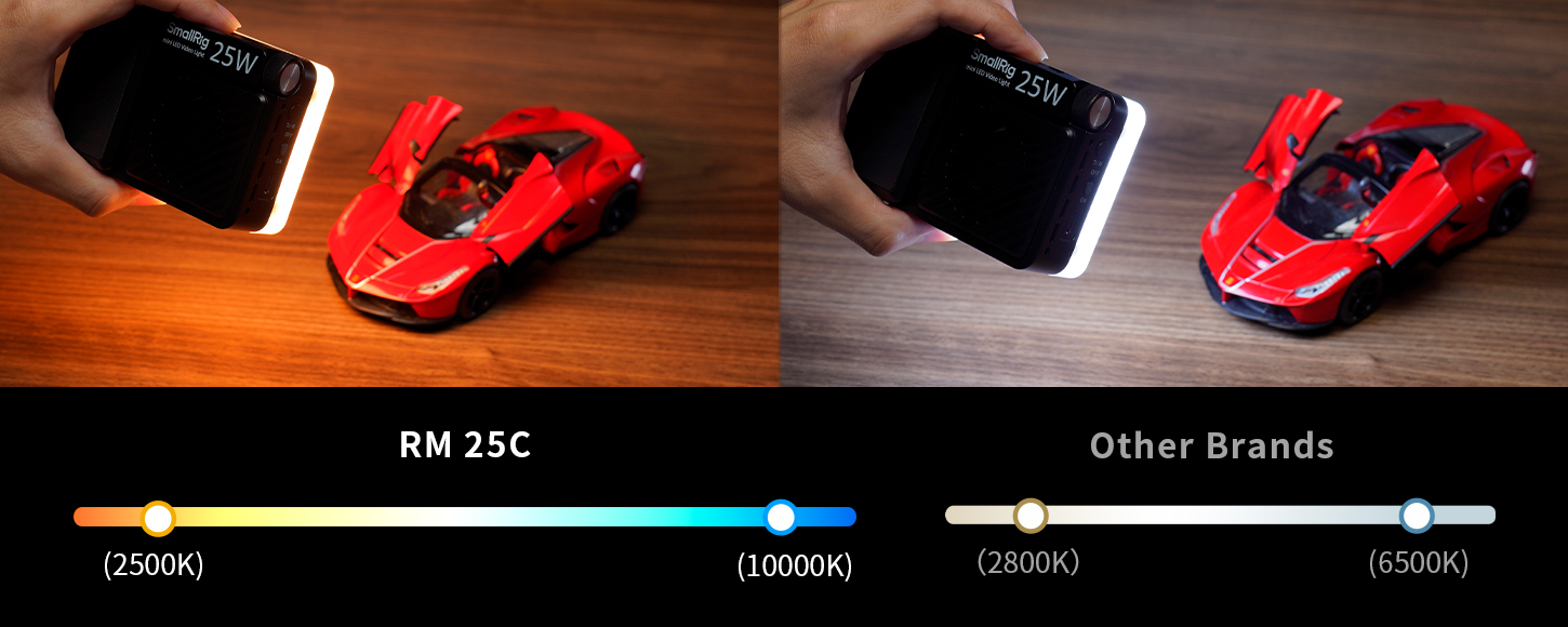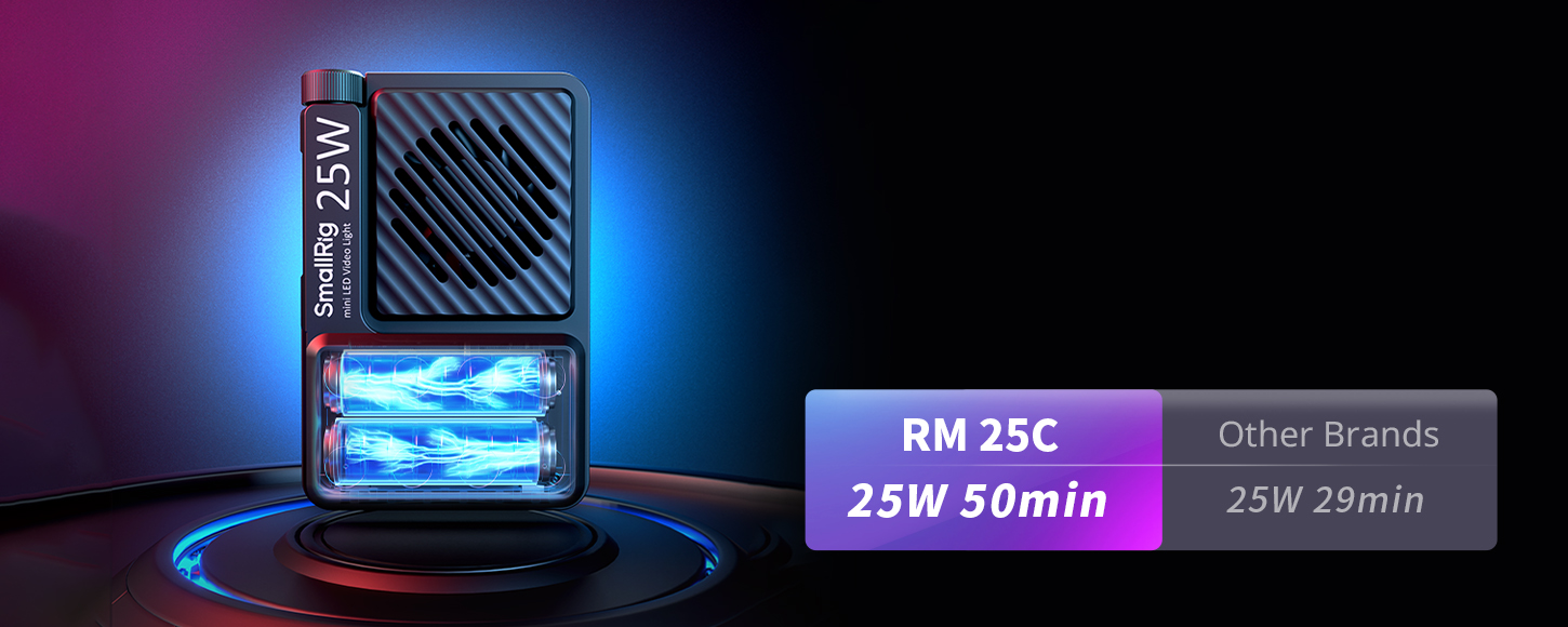 SmallRig RM 25C mini LED video svetlo s integrovanou batériou. Univerzálne osvetlenie RGB+CCT: Vlastnosti: CRI 96, TLCI 99, nastaviteľná dvojfarebná teplota od 2500 K do 10000 K, viac ako 36 000 farieb a 14 zabudovaných svetelných efektov. Ideálne na fotografovanie zátiší, potravín a kreatívne osvetlenie portrétov.
