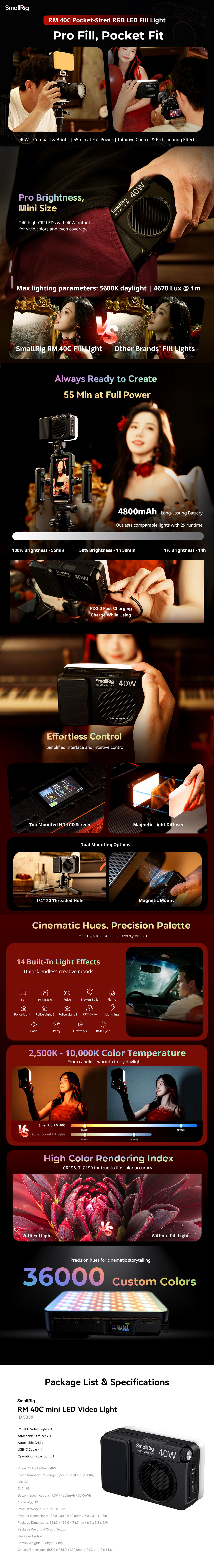 SmallRig RM 40C je 40 W vysokovýkonné mini LED svetlo RGBWW. Kompaktné, ale výkonné, ponúka predĺženú prevádzkovú dobu 55 minút a plnofarebné RGB osvetlenie pre širšiu kontrolu farebnej teploty a gamutu. Vďaka užívateľsky prívetivému ovládaniu, magnetickému upevneniu a rýchlemu nabíjaniu PD je ideálne pre tvorcov, ktorí sú často na cestách.