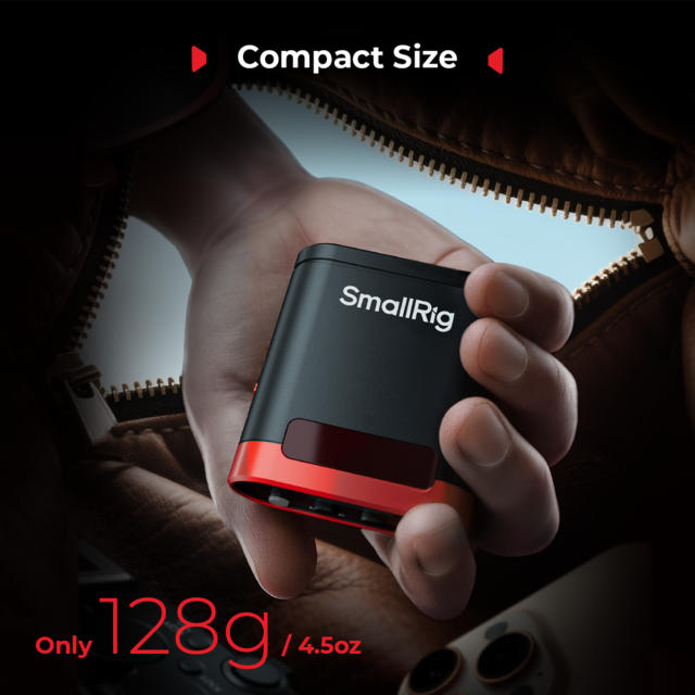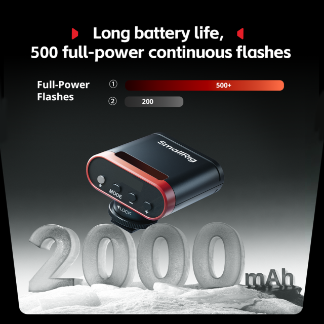 Mini blesk Speedlite SmallRig RS20 je prenosný blesk vreckovej veľkosti. Má veľkosť dlane a nízku hmotnosť len 100 g, čo uľahčuje prenášanie. Je vybavený vysokokapacitnou 2000mAh vstavanou lítiovou batériou, ktorá podporuje nabíjanie cez USB-C. Podporuje až 500 zábleskov na plný výkon a až 10 000 zábleskov pri najdlhšej výdrži, čo zaručuje dlhšie fotografovanie.