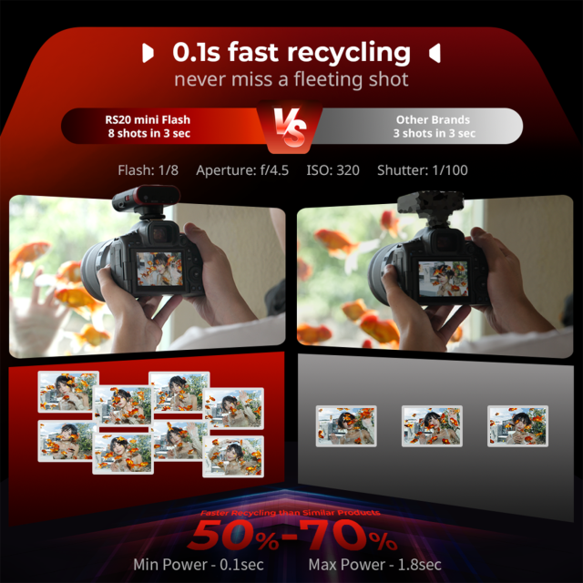 8. Rýchly čas recyklácie 0,1 s až 1,8 s umožňuje efektívne sériové snímanie a trvalý výkon blesku.