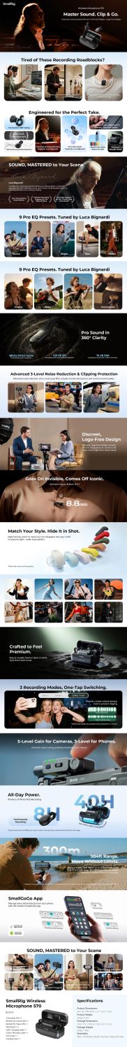 Bezdrôtový mikrofón SmallRig S70-A (All-in-One) (čierny) 5714 je určený pre tvorcov obsahu a streamerov, ktorí pracujú na viacerých zariadeniach. Je ideálny pre širokú škálu scenárov, vrátane živého streamovania, každodenného vlogovania, produkcie krátkych videí, natáčania ciest a rozhovorov.