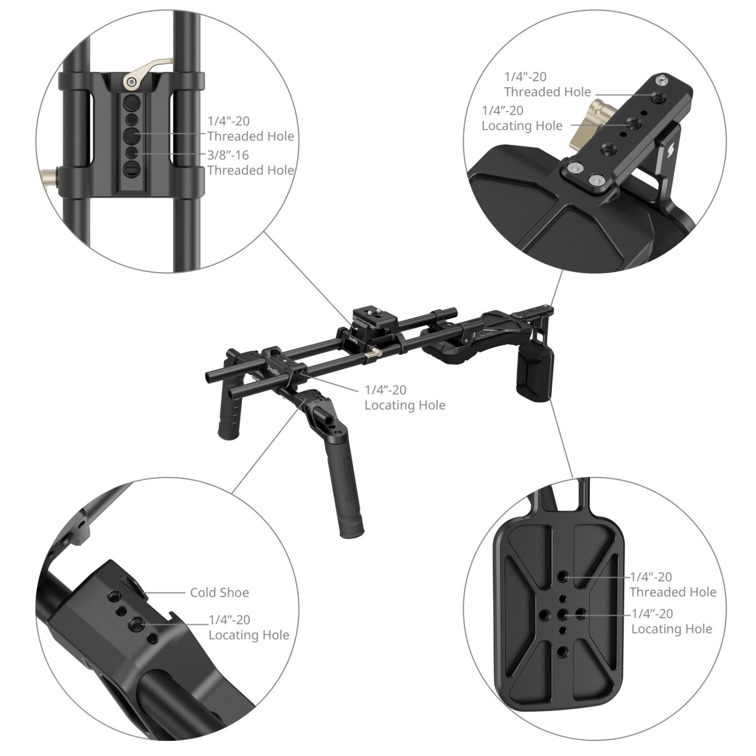 Sada SmallRig Shoulder Rig Kit(klasická verzia) 4480Bje navrhnutá tak, aby poskytovala pohodlné riešenie pre natáčanie z ramena. Vďaka univerzálnemu systému dvoch 15 mm tyčí sa dá prispôsobiť rôznym špecifikáciám fotoaparátov. Vertikálny uhol rukoväte je 15° a dá sa nastaviť otočením o 360°, čo viac zodpovedá zvyku pri držaní; konektor rukoväte používa iba jedno skrutkové upevnenie, čo je pohodlnejšie a rýchlejšie na ovládanie. Súprava montážnej dosky s dvojitou 15 mm tyčovou svorkou využíva v hornej časti špecifikáciu Arca-Swiss, čo umožňuje rýchlu demontáž fotoaparátu pomocou priloženej dosky Arca-Swiss, a klietka s integrovanou doskou Arca-Swiss sa zasúva priamo dovnútra na inštaláciu; Gombíkom je možné zaistiť dve 15 mm tyče, aby sa zariadenie dalo rýchlo demontovať a nastaviť ťažisko; na spodnej strane sú integrované otvory so závitom 1/4“-20 a 3/8”-16, ktoré sa dajú namontovať po rýchloupínacej doske, aby sa dosiahlo rýchle prepínanie medzi nosením na ramene a statívom. Ramenná a chrbtová podložka sú vyrobené z vysoko elastického materiálu, vhodného pre oblúk ramena, ergonomické, poskytujúce pohodlný zážitok pri nosení na ramene; chrbtová podložka je nastaviteľná dopredu a dozadu, vhodná pre ľudí rôznych veľkostí a môže účinne zabrániť posúvaniu zariadenia dopredu; ramenná podložka a chrbtová podložka majú vstavané otvory so závitom 1/4“-20 a polohovacie otvory 1/4“-20, ktoré umožňujú rozšírenie príslušenstva, ako sú batérie s V-mountom, protizávažie a ďalšie príslušenstvo.