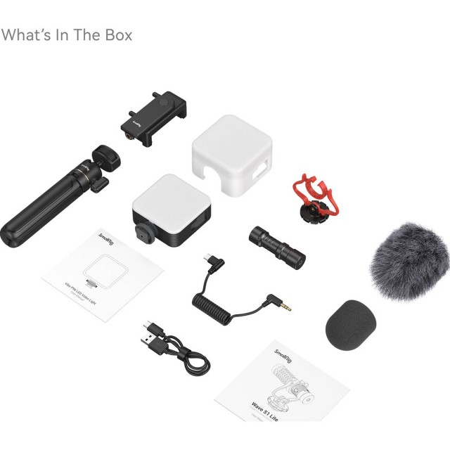Súprava SmallRig Smartphone Vlog Tripod Kit VK-50 Advanced Version 4369 sa skladá zo stolového teleskopického statívu, držiaka smartfónu Easy Loading, mikrofónu Wave S1 Lite On-Camera, LED videosvetla Vibe P96 a softboxu. Táto kompaktná a prenosná súprava má pôsobivú nosnosť 1,5 kg / 3,3 lb. Jednou skrutkou 1/4"-20 sa statív pripevňuje k držiaku smartfónu, ktorý má jedinečnú ľahko vysúvateľnú konštrukciu na rýchle pripevnenie a odstránenie smartfónu. Rotácia rukoväte o 360 stupňov umožňuje bezpečné a rýchle prepínanie medzi orientáciou na výšku a na šírku, zatiaľ čo dvojica úchytov na studenú pätu umožňuje pripevnenie kompatibilného príslušenstva. Okrem toho sa LED svetlo pre videozáznam dodáva s tromi držiakmi studenej pätice, ktoré umožňujú pripevnenie ďalšieho príslušenstva. Má TK 2700-6500K a výdrž batérie až 13,5 hodiny. Statív sa dá zložiť na dĺžku iba 16 cm. Mikrofón Shotgun s 3,5 mm (0,13 palca) káblom Type-C (dodáva sa aj s adaptérom Type-C na Lightning) pre nezastaviteľný zážitok.