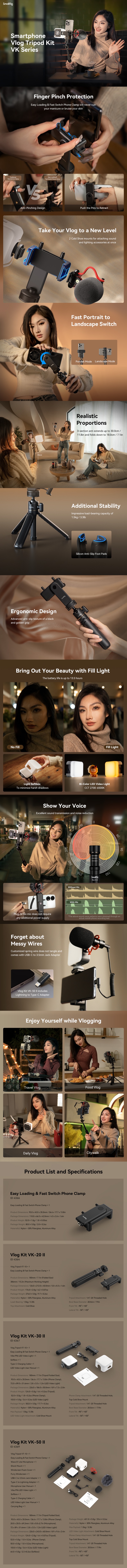 Súprava SmallRig Smartphone Vlog Tripod Kit VK-50 Advanced Version 4369 sa skladá zo stolového teleskopického statívu, držiaka smartfónu Easy Loading, mikrofónu Wave S1 Lite On-Camera, LED video svetla Vibe P96 a softboxu. Táto kompaktná a prenosná súprava má pôsobivú nosnosť 1,5 kg / 3,3 lb. Jednou skrutkou 1/4"-20 sa statív pripevňuje k držiaku smartfónu, ktorý má jedinečnú ľahko vysúvateľnú konštrukciu na rýchle pripevnenie a odstránenie smartfónu.