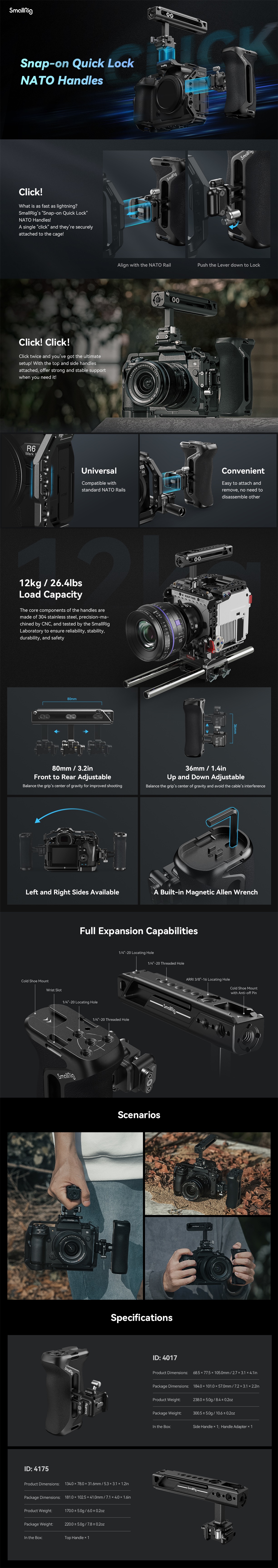 Bočná rukoväť SmallRig Snap-on Quick Lock NATO 4017 je navrhnutá tak, aby uľahčovala pohyb fotoaparátu a stabilizovala zábery pravákov a ľavákov a zároveň poskytovala základné úchyty na príslušenstvo. Rukoväť je kompatibilná so štandardnými lištami NATO a v priebehu jednej sekundy sa zacvakne alebo uvoľní z lišty NATO bez toho, aby bolo potrebné najprv odstrániť iné príslušenstvo, čím sa ušetrí čas potrebný na snímanie. Možno ju ďalej dotiahnuť pomocou kľúča. Protišmykový silikón je pohodlný a vďaka ergonomickému dizajnu sa hodí do ľavej aj pravej ruky.