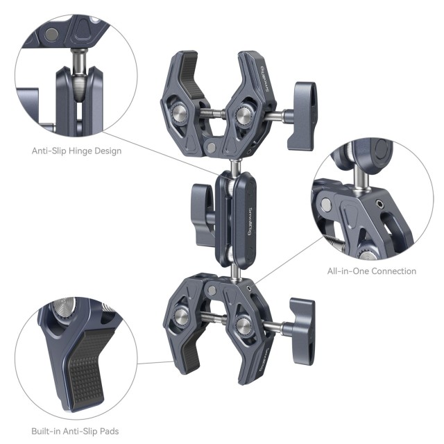 SmallRig Super Clamp s dvojitými svorkami v tvare kraba 4103B je vyrobený z hliníkovej zliatiny leteckej kvality a nehrdzavejúcej ocele, eloxovaný a vyrezávaný CNC procesom na zvýšenie robustnosti a odolnosti. Má kostrovú konštrukciu a žraločiu svorku so silnejšou upínacou silou, ako aj široko kompatibilné závitové otvory 3/8"-16. Svorka, ktorá podporuje tyč s minimálnym priemerom 14 mm a povrch s maximálnou hrúbkou 65 mm, dokáže rýchlo pripevniť dáždniky, selfie tyče, mikrofóny atď. na okrúhle rúry, stoly, riadidlá, tyče statívov a zábradlia.