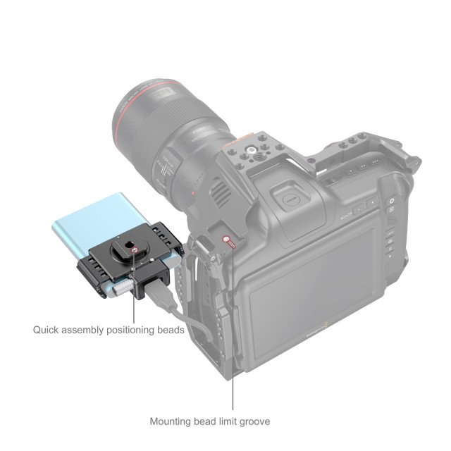 Montážny rám pre SSD disky T5/T7 a klietka SmallRig 3270 pre kameru BMPCC 6K Pro. Upevňuje sa na päticu blesku na ľavej hornej strane klietky alebo na závit 1/4"-20 (skrutka je súčasťou dodávky). Gumové podložky zabraňujú poškriabaniu disku a je tu aj svorka pre kábel USB, ktorú možno ľahko utiahnuť/uvoľniť rukou. Hmotnosť 41 g ±5 g.
