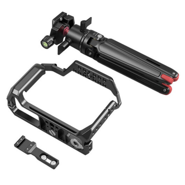 Ľahká hliníková klietka fotoaparátu zachováva prístup ku všetkým portom a ovládacím prvkom a je vybavená viacerými závitmi 1/4"-20 a 3/8"-16, integrovanou rukoväťou na pravej strane, držiakom na päticu a základňou na montáž v štýle Arca. Mini statív je tiež vyrobený z odolného hliníka a je vybavený guľovou hlavou s možnosťou otáčania o 360°, predným náklonom -90 až 45° a bočným náklonom -50 až 50°. Nohy statívu sú skladacie na ručné použitie alebo skladovanie a unesú záťaž s hmotnosťou do 4,4 lb. Nadstavec na pätku sa montuje na klietku pomocou dvoch skrutiek 1/4"-20 a umožňuje pridať príslušenstvo na pätku odsadené od klietky.
