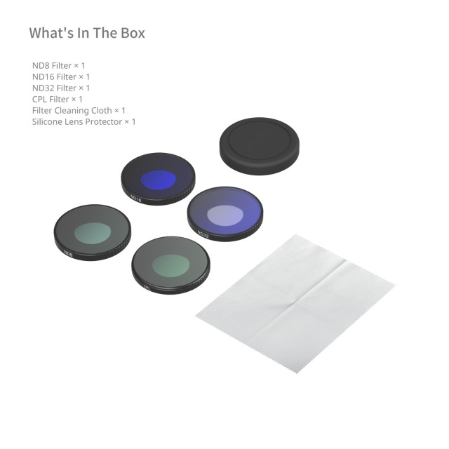 Táto sada filtrov obsahuje filter ND8, filter ND16, filter ND16 a filter CPL, ktoré poskytujú optimálny výkon pri fotografovaní v rôznych prostrediach a zároveň obohacujú vaše zábery o živé farby. Filter ND8 je ideálny pre situácie s jasným denným svetlom, kde dosahuje vyváženú expozíciu a prirodzené obrazy; filter ND16 je navrhnutý pre stredné osvetlenie, ktoré pomáha zachovať detaily v jasných a tmavých oblastiach; filter ND32 je vhodný pre silné svetelné podmienky alebo kreatívne dlhé expozície, ako sú svetelné stopy a efekty rozmazania pohybu; a filter CPL účinne eliminuje nežiaduce odrazy z nekovových povrchov, ako je voda a sklo, a zároveň zlepšuje viditeľnosť pod vodou a cez okná.