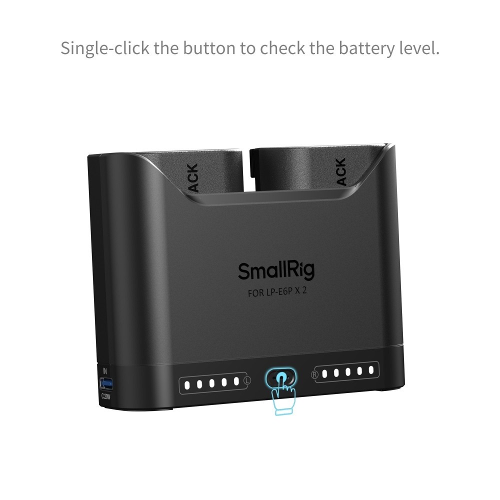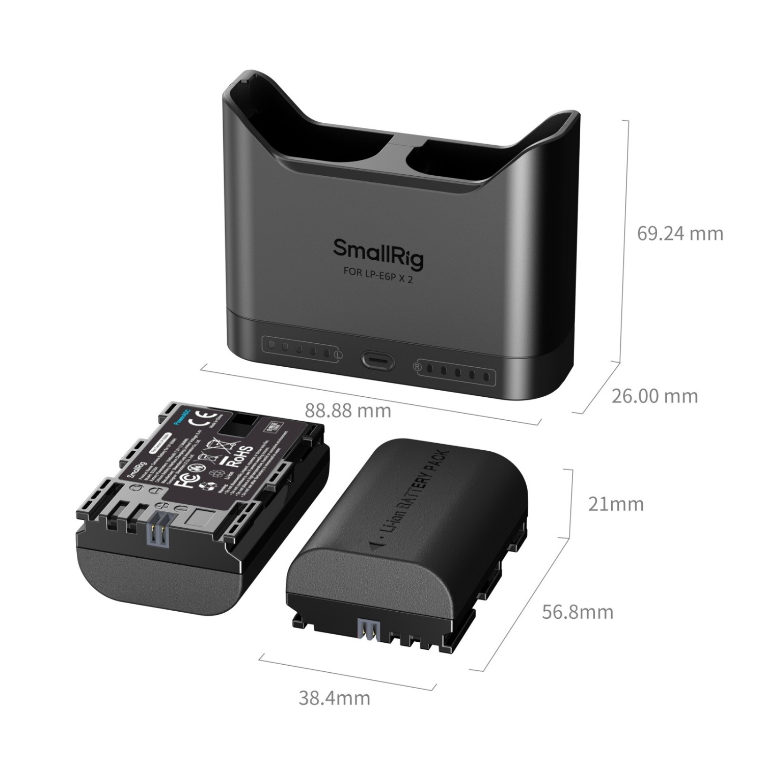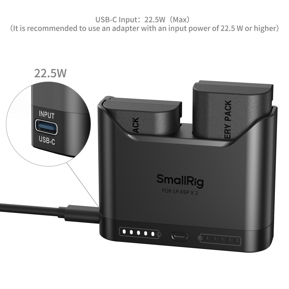 Súprava SmallRig Turbo Charging Kit pre batérie fotoaparátov LP-E6NH 5484 obsahuje dve vysokovýkonné batérie a dvojkanálovú rýchlonabíjačku. Vďaka čipu s plným dekódovaním táto súprava zaručuje plnú kompatibilitu s batériami Canon LP-E6NH, čím eliminuje vyskakujúce varovania a zároveň podporuje zobrazenie stavu nabitia v fotoaparáte a používanie originálnej nabíjačky.