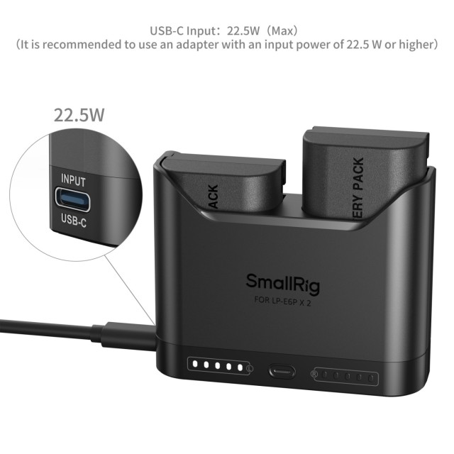 Súprava SmallRig Turbo Charging Kit pre batérie LP-E6P 5485 obsahuje dve vysokovýkonné batérie a dvojkanálovú rýchlonabíjačku. Vďaka čipu s plným dekódovaním táto súprava zaručuje plnú kompatibilitu s batériami Canon LP-E6P a podporuje fotoaparáty ako EOS R5 II. Eliminuje vyskakujúce varovania a zároveň zachováva zobrazenie stavu nabitia v fotoaparáte a kompatibilitu s originálnymi nabíjačkami Canon.