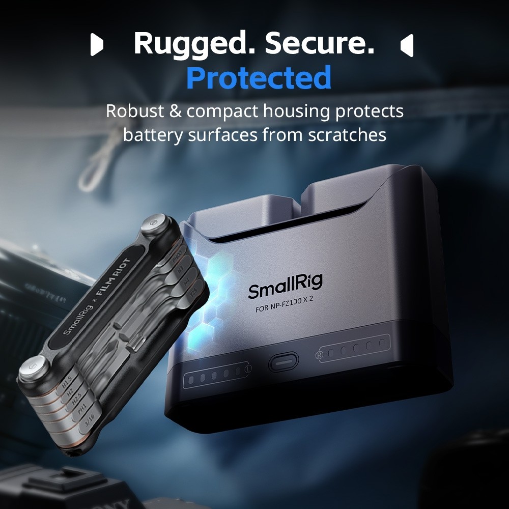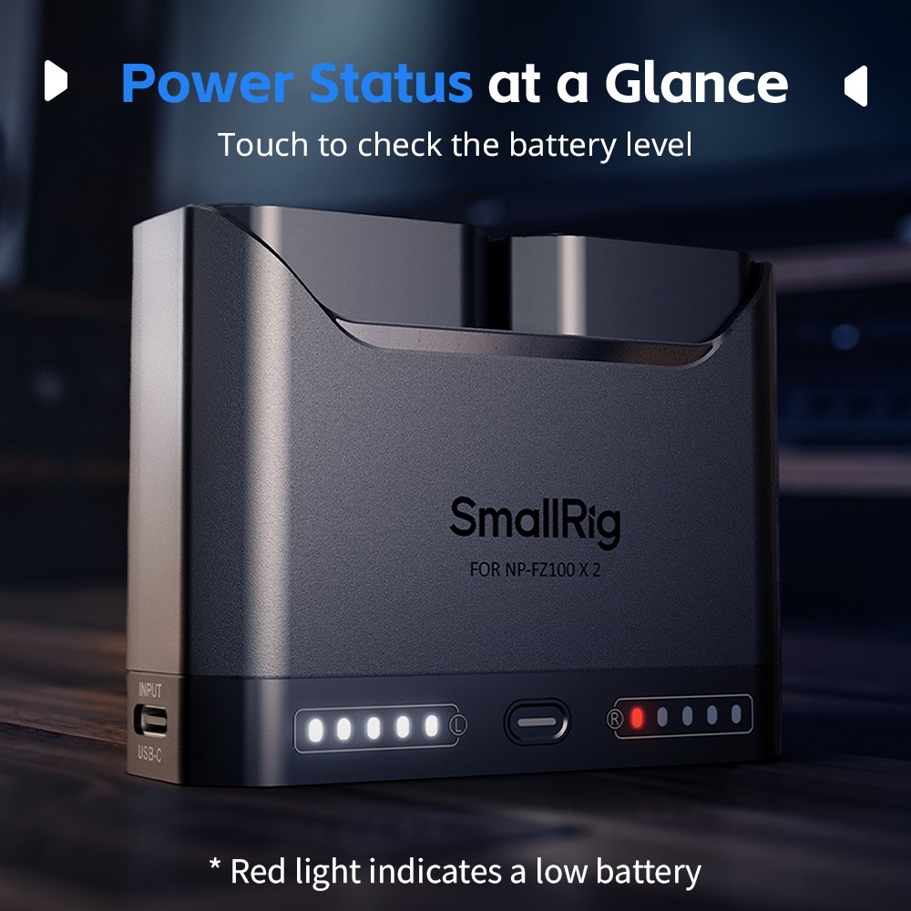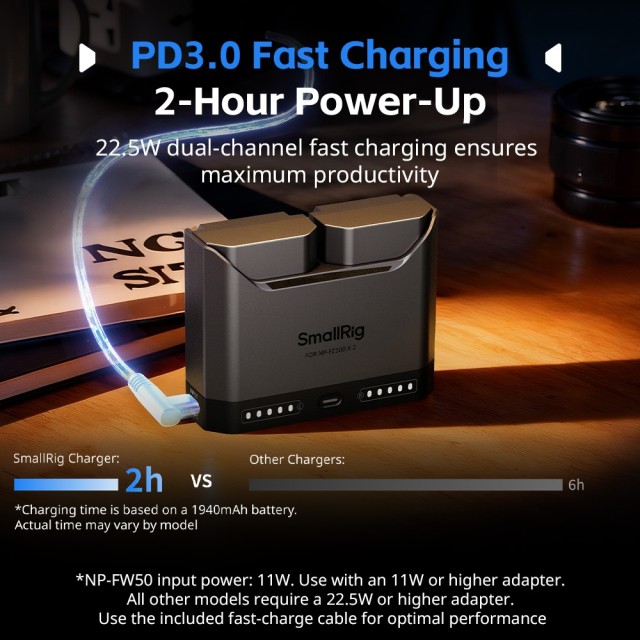 Súprava SmallRig Turbo Charging Kit pre batérie fotoaparátov NP-FW50 5488 obsahuje dve batérie a dvojkanálovú rýchlonabíjačku. Vďaka čipu s plným dekódovaním táto súprava zaručuje plnú kompatibilitu s batériami Sony NP-FW50, čím eliminuje vyskakujúce varovania a zároveň podporuje zobrazenie stavu nabitia v fotoaparáte a používanie originálnej nabíjačky.