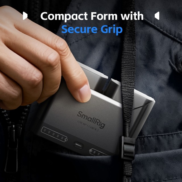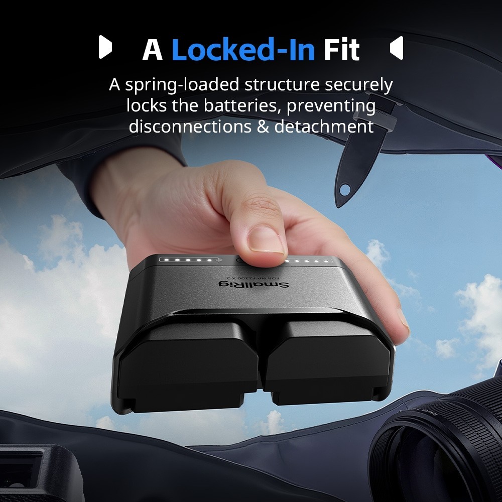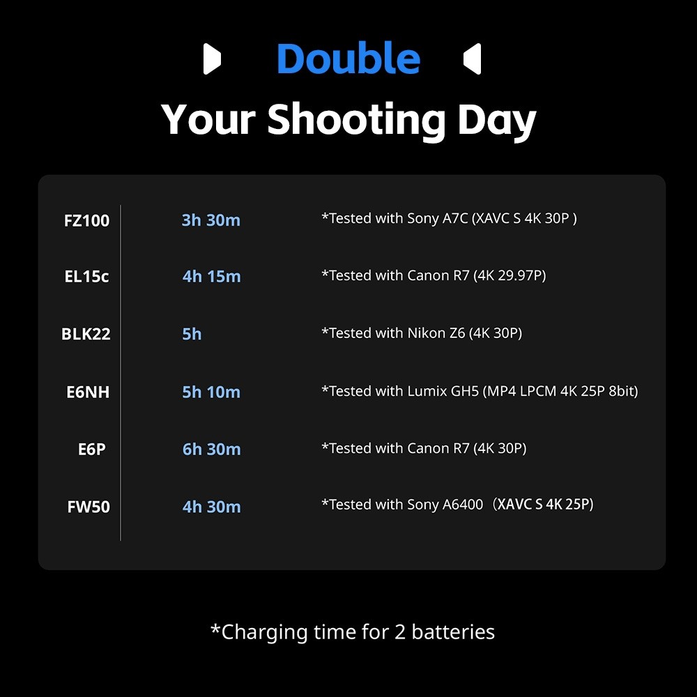 Každá batéria poskytuje skutočný výstup 1030 mAh, čo zabezpečuje dlhší čas fotografovania pre náročné pracovné postupy. Dvojitý slot nabíjačky umožňuje simultánne nabíjanie dvoch batérií alebo nabíjanie jednej batérie, pričom dve batérie sa úplne nabijú za približne 1,5 hodiny pre optimálnu účinnosť.