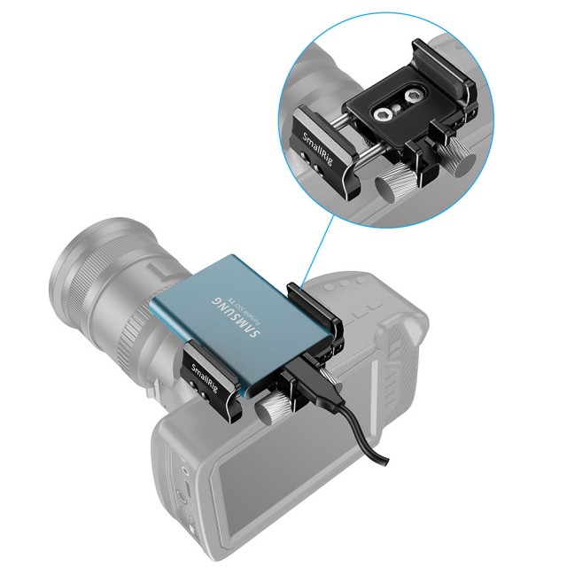 Univerzálny držiak SmallRig pre externý disk SSD BSH2343 je určený na montáž disku SSD na kamery, ako sú BMPCC 4K a 6K a Z Cam E2. Táto pružinová svorka je rozťahovacia na oboch stranách a je vhodná pre rôzne SSD disky, ako napríklad Samsung T5 SSD, Angelbird SSD2go PKT, Glyph Atom SSD, SanDisk 1T SSD, G-Technology G-DRIVE Mobile SSD a ďalšie. Dodáva sa s odnímateľnou studenou päticou, ktorú možno pripevniť na spodnú alebo bočnú časť držiaka, takže SSD môžete pripojiť k adaptéru studenej pätice; alebo po jej odstránení môžete na montáž držiaka použiť skrutku (skrutky) 1/4''-20, ktorá je mimoriadne flexibilná. Držiak je vnútri vybavený mäkkými ochrannými gumovými podložkami, ktoré udržujú disk SSD bezpečne v svorke a zabraňujú poškriabaniu. Navyše sa dodáva s káblovou svorkou na upevnenie kábla USB-C, ktorá sa upevňuje pomocou skrutky s gombíkom. Tento držiak SSD je kompaktný a všestranný pre fotografov a natáčajúcich kameramanov.