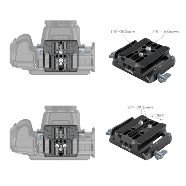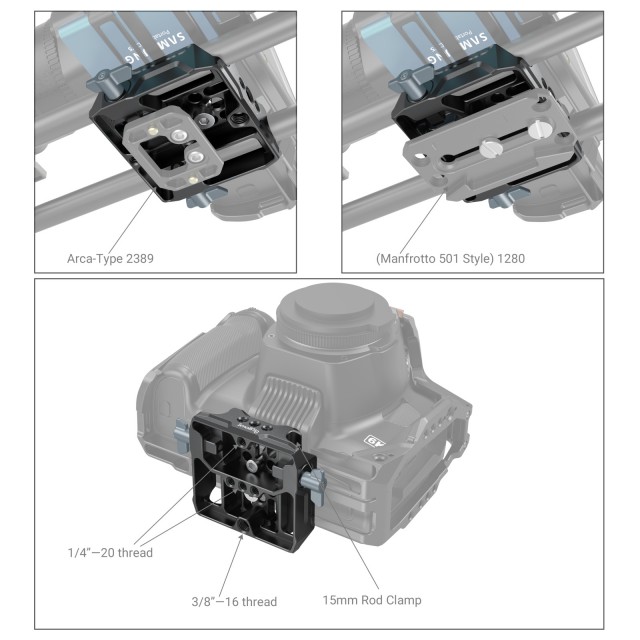 Ľahká a kompaktná univerzálna základná doska SmallRig LWS s dvojitou 15 mm tyčovou svorkou 3357 je vhodná pre bežné klietky digitálnych zrkadloviek a bezzrkadloviek na trhu. Funguje s dvojitou 15 mm tyčou na upevnenie napríklad pomocnej opierky objektívu, follow focusu a matného boxu pri snímaní a fotografovaní z ruky a zo statívu. Pri použití s klietkou BMPCC 6K Pro 3270 môže poskytnúť optickú výšku 85 mm. Jeho špeciálne navrhnutá spodná časť umožňuje vymeniť disk SSD Samsung T5 bez nutnosti demontáže základnej dosky. Veľké zabudované gumové podložky zabraňujú poškriabaniu a skrúteniu. Viacero otvorov so závitom v spodnej časti umožňuje pripevnenie rýchloupínacích doštičiek rôznych veľkostí na snímanie zo statívu.