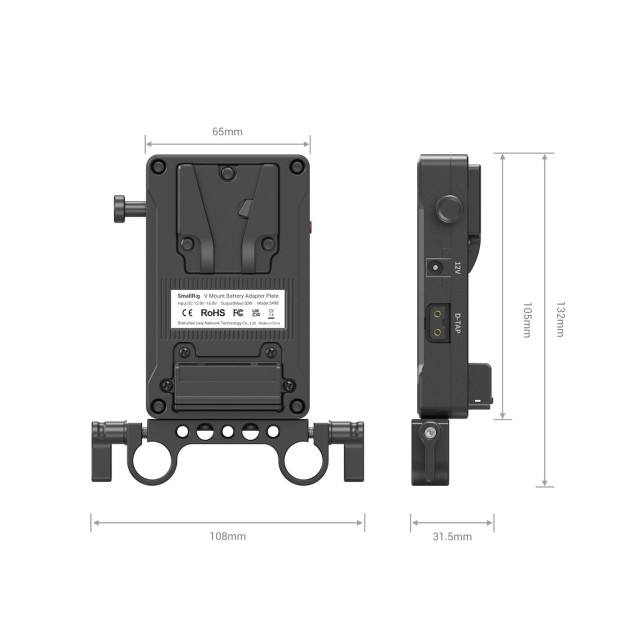 Adaptér SmallRig V Mount Battery Adapter Plate (základná verzia) s dvojitou tyčovou svorkou 3498 je navrhnutý tak, aby poskytoval väčšiu výdrž batérie pre vašu kamerovú súpravu prostredníctvom batérie s V montážou. Jej štandardný rýchloupínací držiak V podporuje väčšinu batérií s držiakom V. Výstupné porty vrátane 8 V DC portu, 12 V DC portu a dvoch 14,8 V D-Tap portov pracujú s V mount batériou na napájanie fotoaparátu a ďalších zariadení (napr. monitora, vysielača, follow focusu, mobilného telefónu atď.) Je vybavený vypínačom napájania, ktorý rýchlo a pohodlne ovláda všetky výstupné porty, a dodáva sa s 15 mm dvojitou tyčovou svorkou, ktorá je vhodná pre 15 mm nosný systém koľajníc. Okrem toho viaceré otvory so závitom 1/4"-20 umožňujú pripojenie ďalšieho príslušenstva, ako je napríklad držiak super clamp a magic arm.