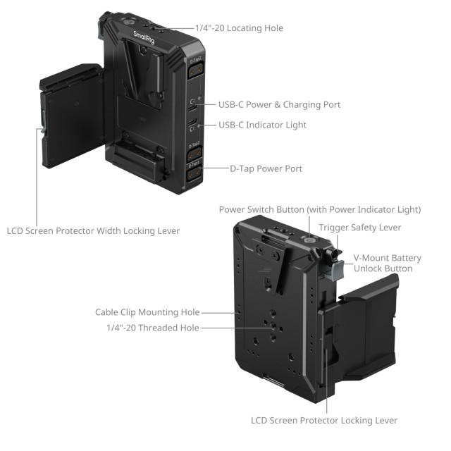 Modulárny ochranný kryt LCD obrazovky sa vyznačuje nastavením výšky a šírky bez použitia náradia, hodí sa na väčšinu bezzrkadlových fotoaparátov s otočnou obrazovkou a zároveň poskytuje ochranu proti nárazom. Doska V-mount je vybavená viacerými otvormi so závitom 1/4"-20 a polohovacími otvormi, čo uľahčuje pripevnenie príslušenstva, ako sú magické ramená (ID 3238B / 3873) pre bezdrôtové vysielače a profesionálne zostavy.