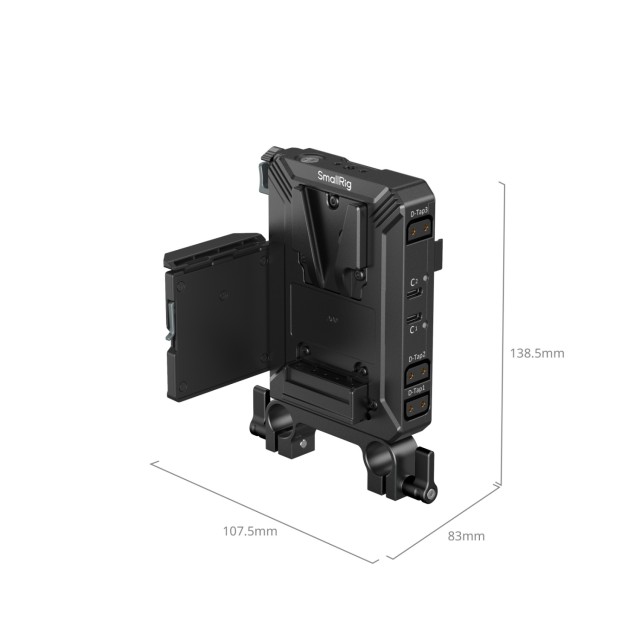 Strategicky umiestnené výstupy napájania, vrátane D-Tap a USB-C, umožňujú simultánne napájanie viacerých zariadení bez ovplyvnenia prevádzky fotoaparátu alebo hornej rukoväti. Port USB-C podporuje vstup PD až do 65 W a slúži zároveň ako nabíjačka batérií V-mount. Bezpečnostná páčka na tlačidle uvoľnenia batérie zabraňuje náhodnému odpojeniu a zabezpečuje bezpečnú prevádzku.
