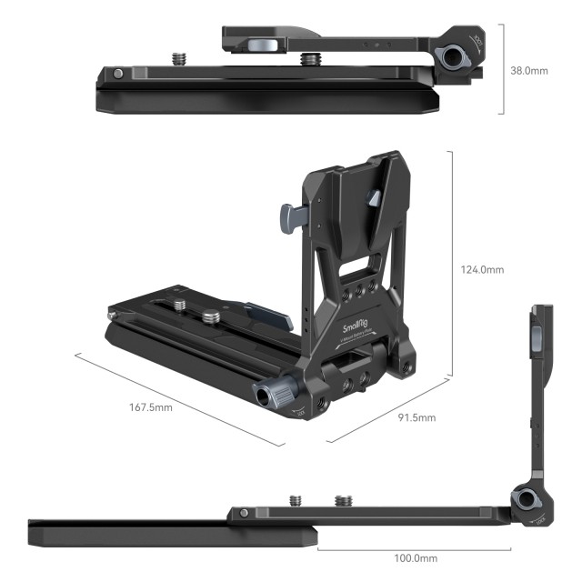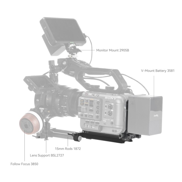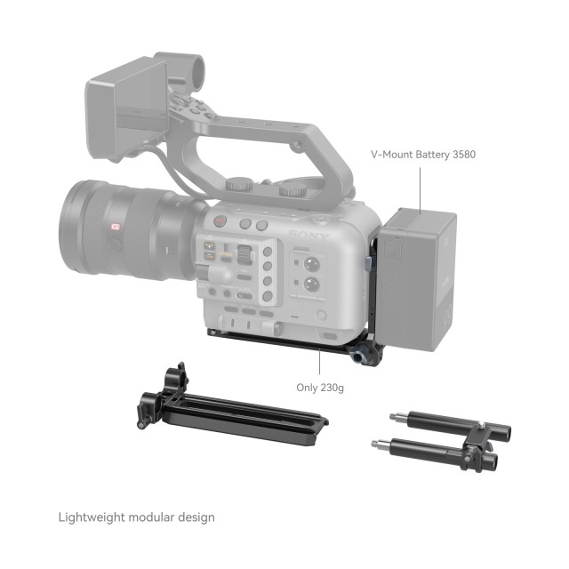 Dosku V-Mount možno otáčať a nastavovať o 180°. Nastavenie dopredu umožňuje pohodlné skladovanie a nastavenie dozadu uľahčuje používanie obrazovky LCD, rozhrania, slotu na kartu atď. na zadnej strane. Na spodnej strane je zabudovaná rýchloupínacia doštička Manfrotto 501 na rýchle prepínanie medzi ručným snímaním a statívom. Súprava V-Mount Battery Mount Plate Kit sa dodáva s 15 mm tyčovou svorkou, dvojitou 15 mm tyčovou svorkou, montážnou konzolou bezdrôtového prijímača a ďalším príslušenstvom. Na predný koniec možno namontovať 15 mm tyčovú svorku, ktorá uľahčuje inštaláciu 15 mm tyčovej svorky na zadnej strane na rozšírenie následného zaostrovania(3781), opierky objektívu(BSL2680), súpravy VND matného boxu (3645) a ďalšieho príslušenstva. Dvojitú 15 mm tyčovú svorku možno nainštalovať vzadu, aby sa uľahčila montáž vysielača obrazu, montážnej dosky na hrudnú podložku MD3183 atď. Súprava sa dodáva s montážnou konzolou bezdrôtového prijímača na kompaktnú montáž bezdrôtového prijímača.
