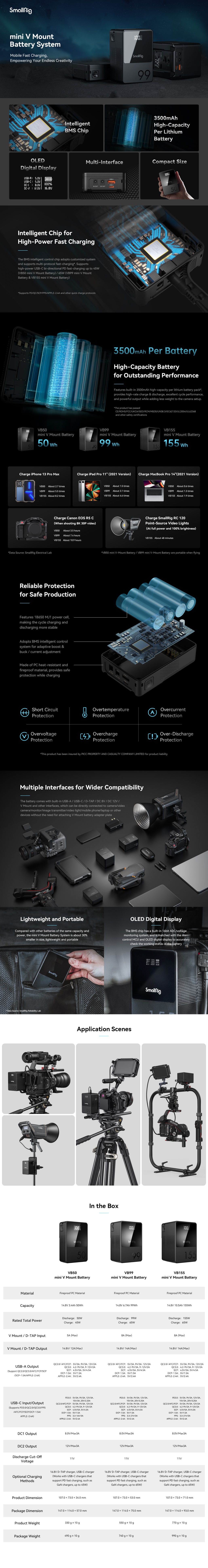 Smallrig 50Wh batéria VB50 mini V Mount má približne 70 % veľkosti bežnej batérie V-mount vzhľadom na jej vysoko integrovaný dizajn, ktorý zaberá menej miesta, takže je ľahšia a prenosnejšia! Vysoko integrovaný (čip protokolu rýchleho nabíjania + MCU + riadenie zvýšenia napätia) čip BMS podporuje širokú škálu hlavných protokolov rýchleho nabíjania (PD / QC / SCP / PPS / APPLE-2,4A atď.), obojsmerné 45W (max.) rýchle nabíjanie USB-C PD, ako aj adaptívne zvýšenie napätia / adaptívnu reguláciu prúdu atď Okrem toho jeho prispôsobený inteligentný systém BMS zabezpečuje rýchlejšie a bezpečnejšie nabíjanie tým, že poskytuje viacnásobnú ochranu proti nadprúdu / skratu / prehriatiu / prepätiu atď. Súčasťou sú aj také rozhrania ako USB-A / USB-C / D-tap / DC 8V / DC 12V / V Mount na efektívne nabíjanie / napájanie fotoaparátu / videokamery / monitora / bezdrôtového vysielača videa / videosvetla / mobilného telefónu / notebooku atď. bez použitia V-mount dosky na konverziu! Čip BMS má 16-bitový algoritmus ADC / merač výkonu spolu s MCU a digitálnym displejom OLED, aby ste mali neustále prehľad o stave batérie. Zabudovaná prémiová vysoko výkonná batéria (bez nafúknutej kapacity), ktorá je nabíjateľná a stabilná, spĺňa normy MSDS / UN38.3 / IEC62133 / UL2054 / UL62368 a ďalšie medzinárodne uznávané normy, čo vám umožní zachytiť každý okamih bez záťaže!
