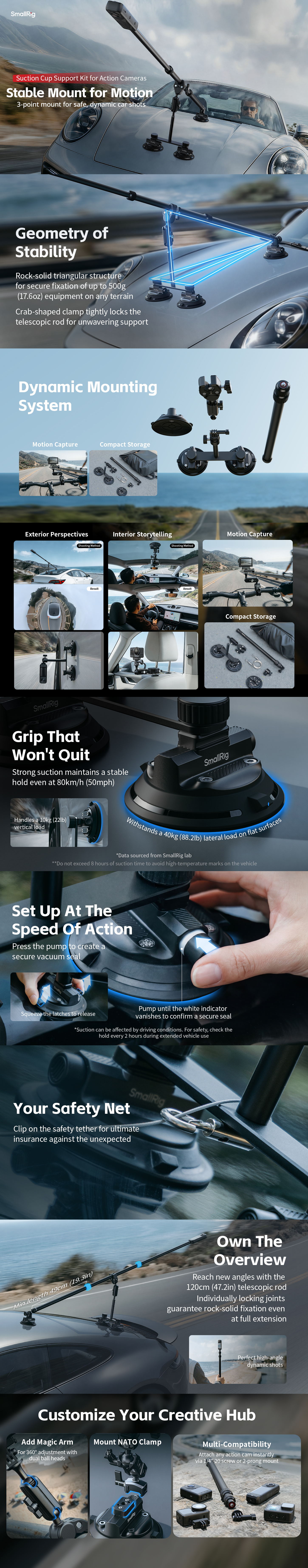 Táto montážna sada, vyrobená hlavne z hliníkovej zliatiny, zaručuje odolnosť a stabilitu s dynamickou nosnosťou 0,5 kg / 1,1 lb, aby vyhovovala väčšine akčných kamier na trhu. Prísavky sú vybavené mechanizmom push-pump a bielou bezpečnostnou indikátorovou čiarou pre jasné sledovanie stavu prisatia, čím zaručujú bezpečnú a stabilnú podporu. Teleskopická tyč sa dá nastaviť od 45 do 120 cm (17,7 až 47,2 palca) a na každej časti má otočné zámky, ktoré zabraňujú skĺznutiu počas dynamického snímania.