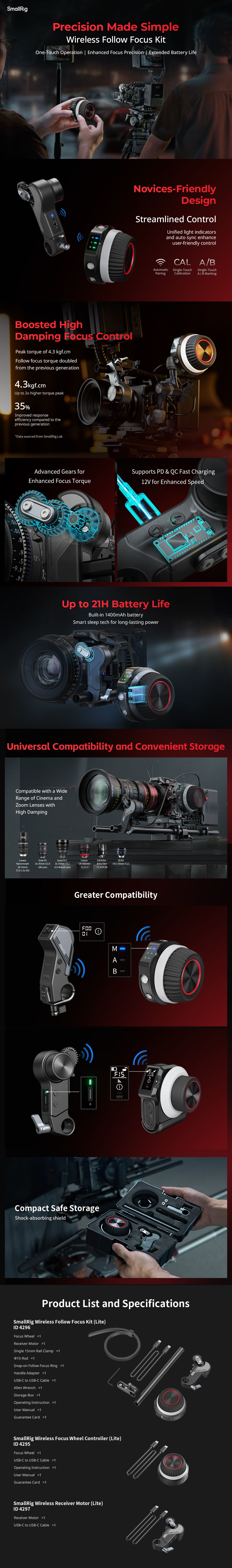 Súprava SmallRig Wireless Follow Focus Kit (Lite) 4296B je navrhnutá tak, aby poskytovala presné zaostrovanie s nízkou latenciou pri snímaní videa. Súprava je vybavená červenými a modrými svetelnými indikátormi na indikáciu stavu pripojenia a kanálov (modré svetlo - F00-1; zelené svetlo - F15-1), ktoré ponúkajú intuitívne a používateľsky prívetivé prevádzkové pokyny na jednoduché a efektívne ovládanie. Súprava je vybavená funkciou ukladania do pamäte, čím sa eliminuje potreba opätovnej kalibrácie nastavenia dráhy objektívu a bodu AB v prípade straty napájania, čím sa zvyšuje efektivita snímania. Toto zariadenie je vybavené vstavanou batériou s kapacitou 1400 mAh a poskytuje približne 21 hodín dlhšieho používania.