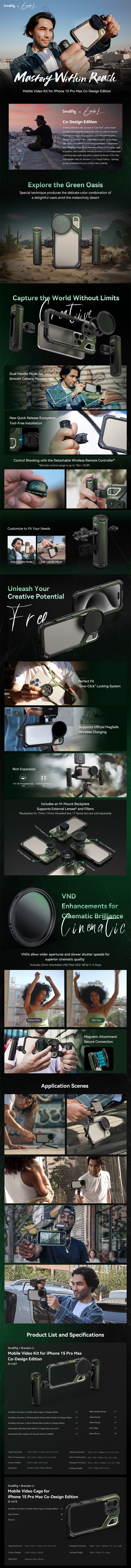 SmallRig x Brandon Li Mobile Video Cage for iPhone 15 Pro Max Co-design Edition 4473 je multifunkčná klietka na iPhone špeciálne navrhnutá pre iPhone 15 Pro Max, ktorá pomáha realizovať vysokokvalitné nahrávanie videa, živé vysielanie a natáčanie vlogov. Kompaktná klietka váži len 85 g. Je vybavená otvormi so závitom 1/4"-20 a studenými topánkami na pripevnenie rukoväte, statívu, mikrofónu, LED videosvetla atď, čo je vďaka úplne novému ekosystému rýchleho uvoľnenia jednoduchšie a rýchlejšie. Na oboch stranách sa nachádzajú otvory na popruhy s priemerom menším ako 2 mm. Umožňuje nasadiť objektív s bajonetom M alebo po výmene zadnej dosky objektív so závitom 17 mm / 37 mm, objektív Moment série T. Je jemne vydlabaný, aby umožnil plný prístup ku všetkým tlačidlám, portom, radarovému ultraširokouhlému objektívu a bezdrôtovej nabíjačke MagSafe. Ľahko použiteľná konštrukcia s rýchlym uzamknutím a uvoľnením je bezpečnejšia a stabilnejšia a zabraňuje náhodnému odomknutiu z dôvodu nesprávneho dotyku. Celokovová celokovová klietka je vybavená aj zabudovanými podložkami, ktoré zabraňujú prípadným nárazom a poškriabaniu. Nasadenie tejto klietky by vám nebránilo v snímaní horizontálnych alebo vertikálnych fotografií.