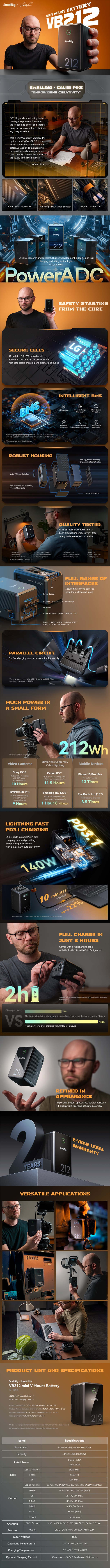 SmallRig x Caleb Pike VB212 mini V Mount Battery 4293 s vysoko integrovanou konštrukciou, vďaka ktorej sa zmenšila veľkosť batérie a je ľahšia a prenosnejšia. Batéria kombinuje čipy protokolu rýchleho nabíjania, MCU, riadenie napätia a čipy BMS. Podporuje širokú škálu protokolov rýchleho nabíjania (PD 3.1 / QC 3.0 / AFC atď.), obojsmerné rýchle nabíjanie a vybíjanie PD 140 W (max.) a adaptívnu reguláciu napätia/prúdu atď. Okrem toho jeho prispôsobený inteligentný systém BMS zabezpečuje rýchlejšie a bezpečnejšie nabíjanie tým, že poskytuje ochranu proti nadprúdu / skratu / prehriatiu / prepätiu atď. Telo batérie je vybavené rozhraniami D-Tap / USB-C / USB-A / DC 8V-OUT / DC12V-OUT / BP, ktoré môžu nabíjať alebo napájať fotoaparát / videokameru / monitor / bezdrôtový vysielač obrazu / LED video svetlo / mobilný telefón / notebook atď. bez použitia akýchkoľvek dosiek na montáž do V.