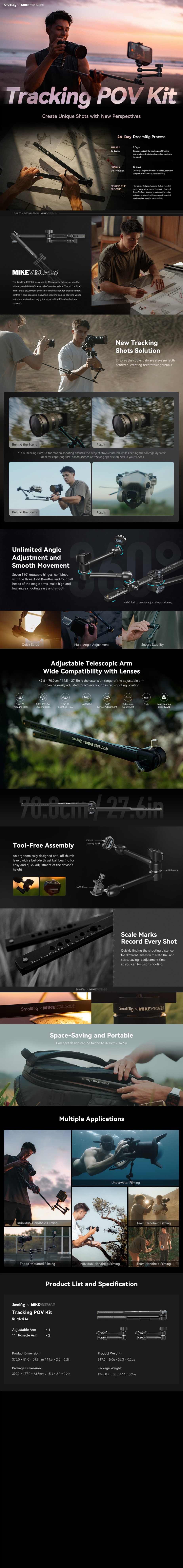 Súprava SmallRig x Mikevisuals Tracking POV Kit MD4362 bola navrhnutá spoločnosťou Mikevisuals, ktorá sa zaoberá filmovaním filmov, cestovným ruchom, vedou a technológiou v rámci programu DreamRig spoločnosti SmallRig. Jej cieľom je uľahčiť sledovanie záberov, približovanie a odďaľovanie atď. Nastaviteľné rameno sa dodáva s takými držiakmi na príslušenstvo, ako sú otvory so závitom 1/4"-20, lokalizačné otvory ARRI 3/8"-16, ako aj koľajnice NATO, ktoré rýchlo spájajú magické ramená a pomáhajú upraviť vzdialenosť snímania. Rameno možno predĺžiť o 49 - 70 cm / 19,5 - 27,6 palca a skrátiť na 37 cm pre jednoduché skladovanie, pričom nosnosť oboch koncov je 3 kg / 6,6 libry. Obe koľajnice NATO sú dlhé 20,5 cm / 8,1 palca, vhodné pre rôzne ohniskové vzdialenosti objektívov a vybavené stupnicami na zaznamenávanie údajov o vzdialenosti. Rozetové rameno 11'' s nosnosťou 3 kg je tiež vybavené skrutkou 1/4"-20 s lokalizačnými kolíkmi a koľajnicou NATO.