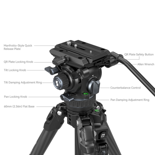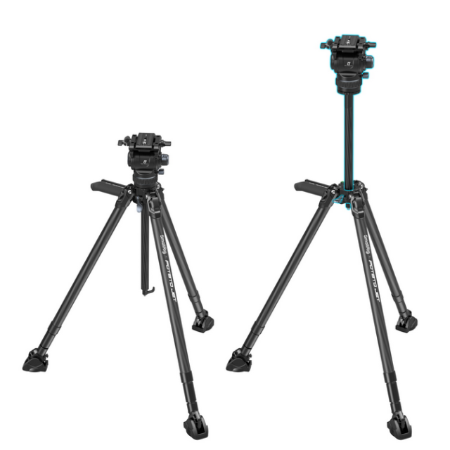Vďaka konštrukcii z uhlíkových vlákien je statív ľahký a ľahko prenosný bez zníženia pevnosti a podporuje maximálnu nosnosť, aby vyhovoval potrebám väčšiny profesionálnych kameramanov. Nohy statívu sú vybavené rýchloupínacími zámkami, ktoré umožňujú rýchle a bezpečné nastavenie, a nastaviteľná stredová rozperná tyč dodáva statívu väčšiu stabilitu na nerovnom teréne. Súčasťou súpravy je aj polstrovaná taška na pohodlné prenášanie a skladovanie.