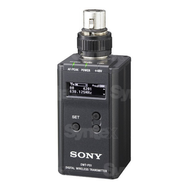 Sony DWT-P01 je bezdrôtový plug-on ("kocka") vysielač. Pracuje v šírke pásma 66MHz, od 566MHz do 607MHz a od 615MHz do 638MHz. Audio vstup je možné zvoliť s mikrofónu alebo z linky. Sony DWT-P01 ponúka 1, 10 alebo 50mW RF výstupný výkon. Vysielač pracuje približne 5 hodín, pri použití dvoch AA batérií a nastavení výstupného výkonu na 10mW. Vysielač ponúka input attenuator, voľbu RF frekvencie, RF výstupný výkon, LCF, fantómové napájanie a možnosť diaľkového ovládania power sleep módu vysielača z bezdrótového prijímača.