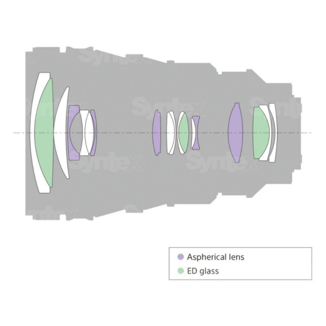 Skladá sa z 18-tich šošoviek zoradených do 12-tich skupín. V optickej sústave je použitých 5 špeciálne tvarovaných šošoviek s asférickým povrchom a 3 šošovky vyrobené zo špeciálneho nízko rozptylového ED skla.