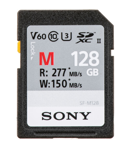 Pamäťová karta Sony SF-M UHS-II SDXC s kapacitou 128 GB ponúka vysokú rýchlosť s rýchlosťou čítania až 277 MB/s a rýchlosťou zápisu až 150 MB/s, vďaka čomu je ideálna na nahrávanie videa v rozlíšení 4K a sériové fotografovanie.