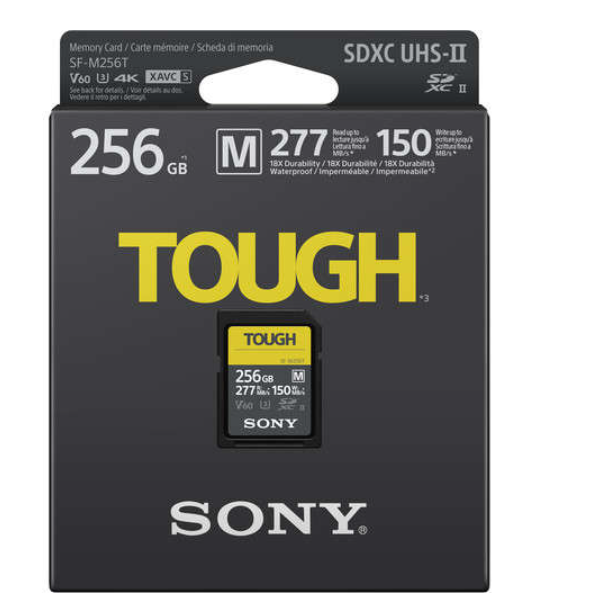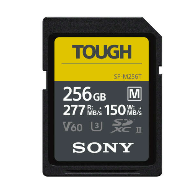 Pamäťová karta Sony SDXC Tough SF-M 256 GB V60 UHS-II ponúka vysokú rýchlosť a mimoriadnu odolnosť a je určená na profesionálne nahrávanie videa v rozlíšení 4K/8K a sériové fotografovanie v náročných podmienkach.