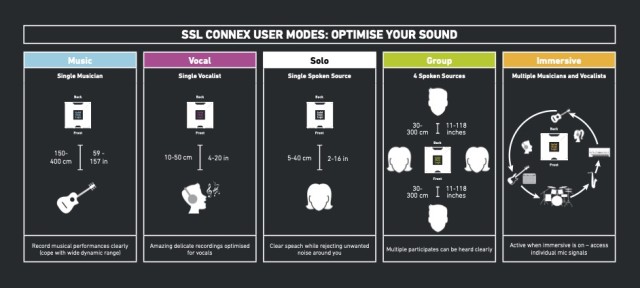 SSL CONNEX je vybavený pokročilou štvoricou mikrofónov so štyrmi špeciálne definovanými používateľskými režimami, vďaka ktorým budete znieť skvele v každom scenári. Všetky štyri režimy sú vybavené pokročilým nastavením pohlcujúceho nahrávania. To vám umožňuje prístup ku každému zo štyroch jednotlivých mikrofónových zdrojov na účely pohlcujúcich a priestorových nahrávok alebo vysielania.