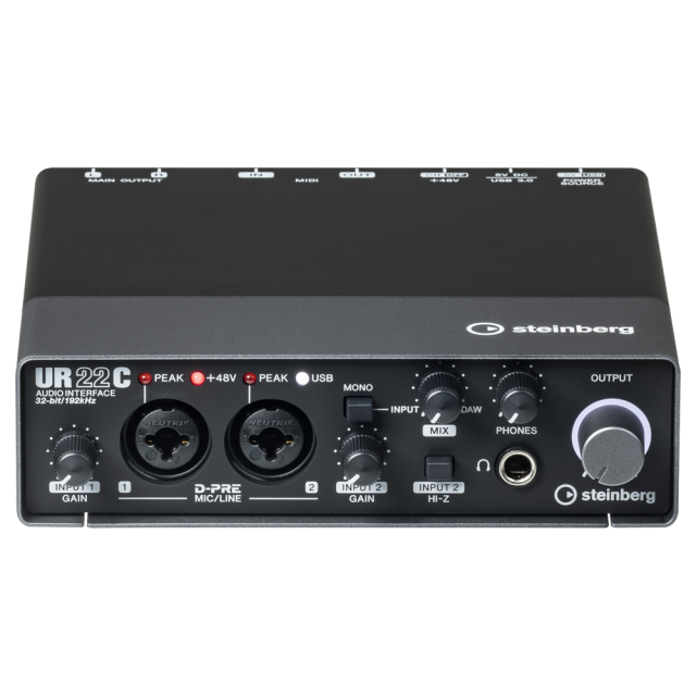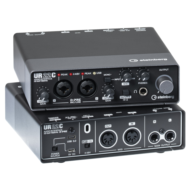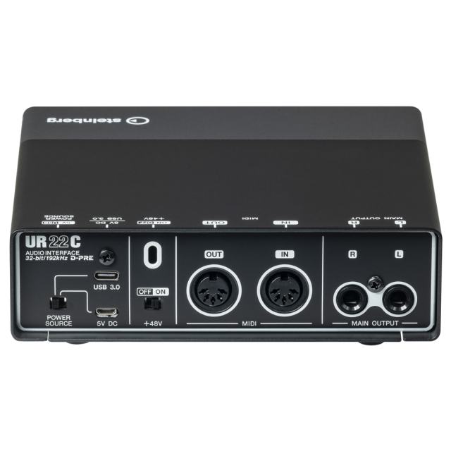 Steinberg UR22C je USB 3.0 audio interface s pripojením USB-C disponujúci dvomi vstupmi, dvomi výstupmi a MIDI pripojením. Spracovanie audio signálu v rozlíšení 32-bit/192kHz a hardvérový latency-free monitoring v spojení s Cubase alebo iným DAW poskytuje profesionálne záznamové možnosti.