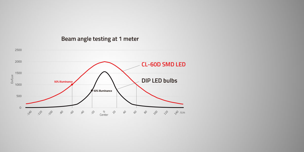 LED diódy SMD majú širší uhol vyžarovania v porovnaní s tradičnými LED žiarovkami DIP. Vytvárajú rovnomerne rozložené osvetlenie od stredu po okraj, namiesto oslnivého svetelného bodu, ktorý sa náhle zníži od stredu po okraj.