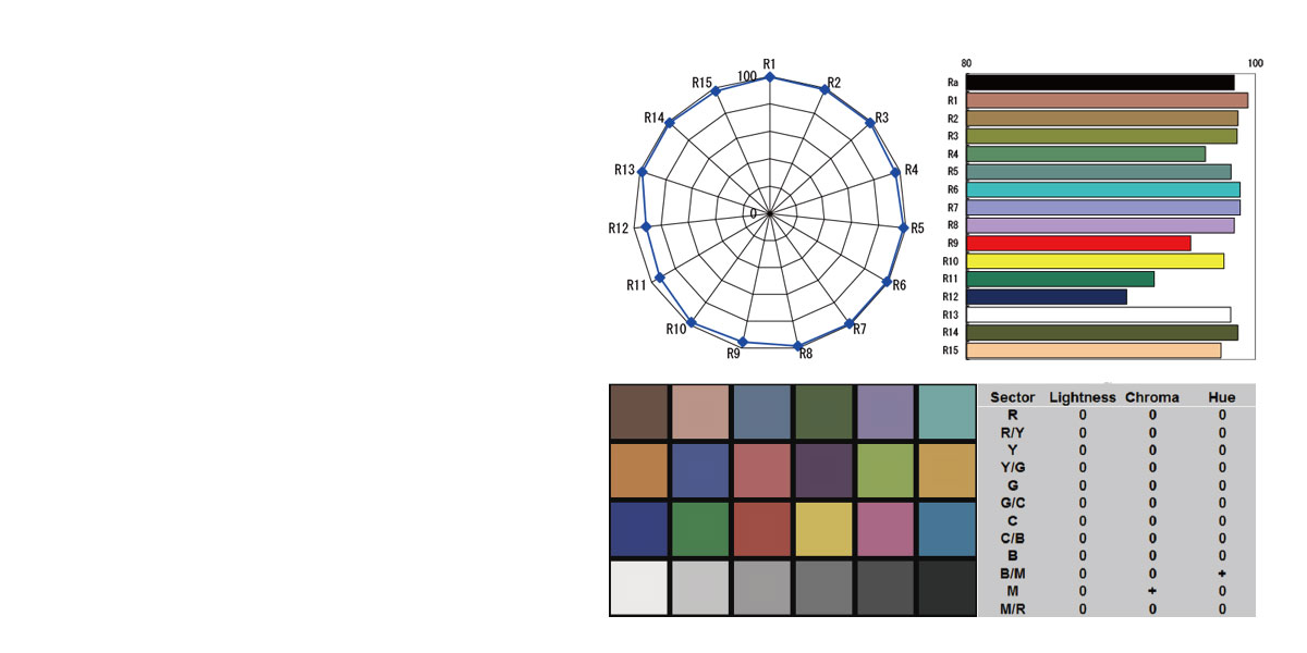CRI (index podania farieb) je mierou schopnosti svetelného zdroja verne odrážať farby rôznych objektov v porovnaní s prirodzeným zdrojom svetla. A TLCI (index konzistencie televízneho osvetlenia) je špeciálny pre schopnosť odrážať farby senzorom fotoaparátu. Maximálna hodnota 100.