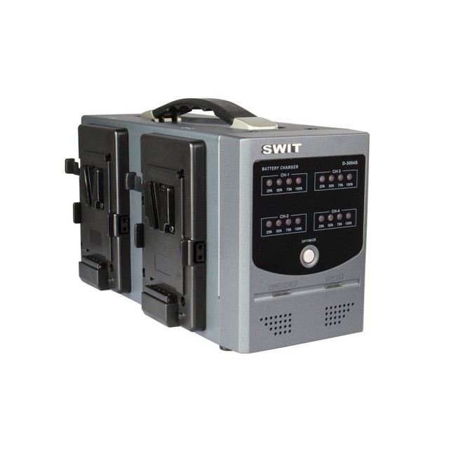 SWIT D-3004S je prenosná simultánna 4-kanálová nabíjačka pre V-mount batérie so 4-úrovňovým LED indikátorom stavu nabíjania pre každý kanál.
